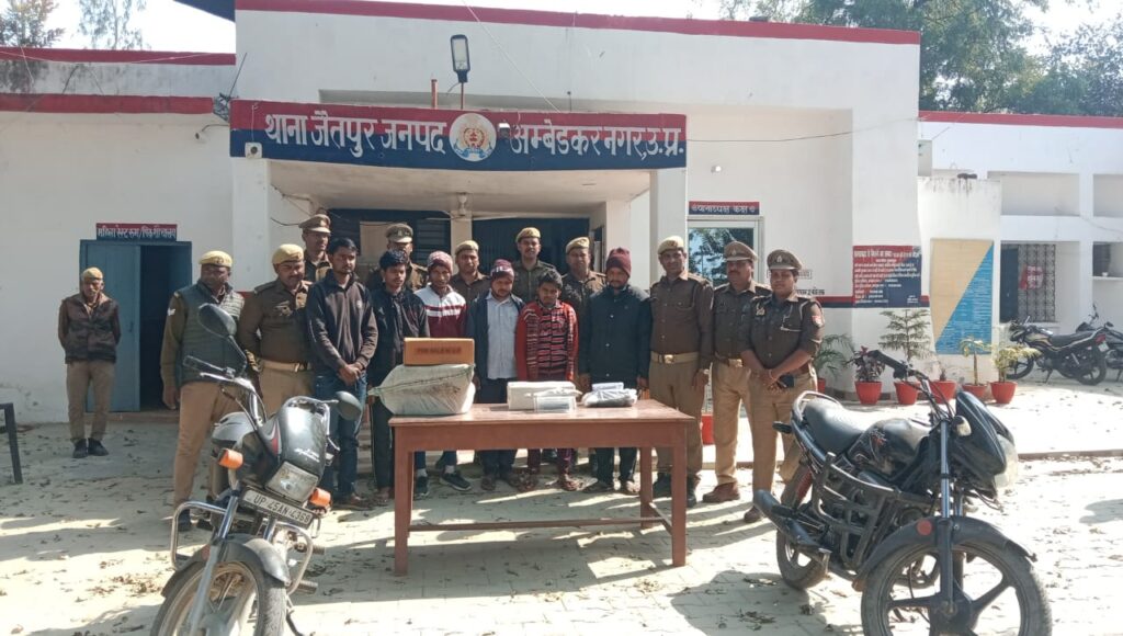 आपको बताते चले की जैतपुर थाना क्षेत्र के अंतर्गत कुसुमखोर ग्राम सभा के बाहर स्थित देसी शराब के ठेके पर 30 जनवरी रात 10:00 से 11:00 के बीच में तबंचे के बल पर भारी लूट की घटना को अंजाम दिया गया। जैतपुर थाना प्रभारी वंदना अग्रहरि के नेतृत्व में हेड कांस्टेबल दुर्गेश सिंह, एस आई कृष्णा चंद्र शुक्ला, एस आई राहुल यादव, कृपा शंकर यादव कांस्टेबल हरि श्याम सरोज, बृजेश यादव की टीम में घटना को अंजाम देने वाले आरोपियों को 1 फरवरी को गिरफ्तार कर आरोपियों के पास से शराब देसी मसाला पांच पेटी, ब्लू लाइन देसी एक पेटी, 315 बोर तमंचा, एक डीवीआर, एक एलसीडी और आरोपियों द्वारा एक एलसीडी को तालाब में फेके जाने की सूचना पर पुलिस द्वारा कड़ी मशक्कत के बाद गोताखोरो ने तालाब में फेकी गयी एलसीडी बरामद किया ।थाना प्रभारी बन्दना अग्रहरी ने बताया कि अभिषेक मौर्य उर्फ मोनू पुत्र अनिल मौर्य निवासी ग्राम सवरगह थाना जैतपुर जनपद अंबेडकर नगर उम्र करीब 25 वर्ष को धारा 310( 2) 127 (2) 317(2) बीएनएस व 3 / 25 आर्म्स एक्टऔर बंटी सिंह उर्फ राम सिंह पुत्र स्वर्गीय विजय बहादुर सिंह निवासी ग्राम ढाका मेदनीपुर थाना जैतपुर जनपद अंबेडकर नगर उम्र करीब 27 वर्ष अंतर्गत धारा 310 (2) 127 (2) 317( 3) बीएनएस, अखिलेश राजभर पुत्र रामजीत निवासी ग्राम ढाका मेदनीपुर थाना जैतपुर अंतर्गत धारा उम्र करीब 30 वर्ष धारा 310 (2) 127(2) 317( 3 )बीएनएस, राजकुमार पुत्र स्वर्गीय चुन्नीलाल निवासी ग्राम ढाका मेदनीपुर थाना जैतपुर उम्र लगभग 19 वर्ष अंतर्गत धारा 310 (2) 127(2) 317( 3)बीएनएस, जुगेश यादव पुत्र रामबूझ यादव निवासी ग्राम किशनपुर कबिरहा पूरवा थाना जयपुर उम्र करीब 19 वर्ष अंतर्गत धारा 310 (2) 127(2) 317 (2)(3) बीएनएस, अंकेश कुमार पुत्र धर्मेंद्र कुमार निवासी सवरगह थाना जैतपुर उम्र करीब 19 वर्ष अंतर्गत धारा 310(2) 127 (2) 317 (3) बीएनएस धारा के अंतर्गत अग्रिम कार्रवाई कर आरोपियों को जेल भेज दिया गया है।स्थानीय लोगों द्वारा थाना प्रभारी के नेतृत्व में गठित टीम के द्वारा चोरी की घटना का सफल अनावरण करने पर भूरि भूरि प्रशंसा की जा रही है।