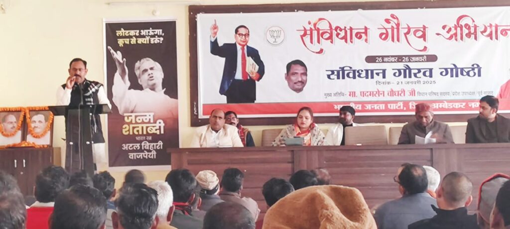 अंबेडकरनगर। संविधान गौरव अभियान के अंतर्गत मंगलवार को भाजपा जिला कार्यालय अटल भवन में मुख्य अतिथि जिला प्रभारी भाजपा प्रदेश उपाध्यक्ष विधान परिषद सदस्य पदम सेन चौधरी की उपस्थिति एवं भाजपा जिलाध्यक्ष त्रयंबक तिवारी की अध्यक्षता और जिला महामंत्री बाबा राम शब्द यादव के संचालन में संविधान गौरव गोष्ठी का आयोजन किया गया।