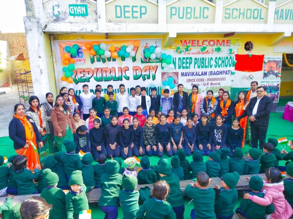 बागपत, उत्तर प्रदेश। विवेक जैन। जनपद बागपत के ज्ञान दीप पब्लिक स्कूल मवीकलां खेकड़ा में 76 वां गणतंत्र दिवस बड़े ही धूमधाम और हर्षोल्लास के साथ मनाया गया। इस अवसर पर आयोजित कार्यक्रम में नेशनल अवार्डी एवं उत्तर प्रदेश सरकार द्वारा सम्मानित वरिष्ठ पत्रकार विपुल जैन ने मुख्य अतिथि के रूप में शिरकत की। कार्यक्रम का शुभारम्भ स्कूल के प्रबंधक जय सिंह शर्मा, अध्यक्ष देवदत्त शर्मा, मुख्य अतिथि विपुल जैन, प्रधानाचार्य ब्रिजेश शर्मा ने संयुक्त रूप से मां सरस्वती के चित्र के सम्मुख दीप प्रज्जवलित कर, ध्वजारोहण कर राष्ट्रगान के साथ किया। स्कूल प्रबन्ध समिति द्वारा आमंत्रित अतिथियों का माला, पटका व पगड़ी पहनाकर अभिनन्दन किया गया।