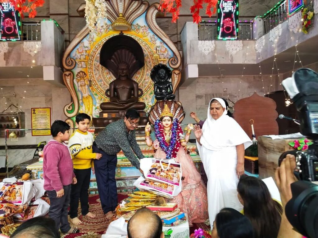 मां पद्मावती जी की भक्ति आराधना में मुख्य चोले का सौभाग्य अनिल जैन पुत्र सिद्धार्थ जैन, राहुल जैन मॉडल टाउन दिल्ली, मालार्पण का सौभाग्य कपिला जैन पत्नी आशीष जैन गुड़गांव, दीप प्रज्जवलन का सौभाग्य अनिता जैन पत्नी पवन जैन दरियागंज, गोद भराई का सौभाग्य सतीश जैन, अंजली जैन, मनोज जैन रेणु जैन खेकड़ा, मेवा अर्पण का सौभाग्य तनूजा जैन पत्नी अमित जैन मॉडल टाउन दिल्ली, फल अर्पण का सौभाग्य रीता जैन पत्नी मुकेश जैन राधेपूरी, मिठाई अपर्ण का सौभाग्य मुनिल जैन पुत्र अंकुश जैन पुत्रवधु रेनू जैन खेकड़ा, पाद प्रक्षालन का सौभाग्य दीपा जैन पत्नी दीपक जैन मॉडल टाउन दिल्ली, शास्त्र भेंट का सौभाग्य मंजू जैन पत्नी आदिश जैन लक्ष्मी नगर दिल्ली, पिच्छीका भेंट का सौभाग्य नेमचन्द जैन अनिता जैन अभिषेक जैन, वैभव जैन, नमन जैन, राजगढ़ दिल्ली, वस्त्र भेंट का सौभाग्य मीनू जैन पत्नी राजेश जैन रोहिणी दिल्ली, आरती दिव्या जैन पत्नी गौरव जैन लक्ष्मी नगर दिल्ली को प्राप्त हुआ।