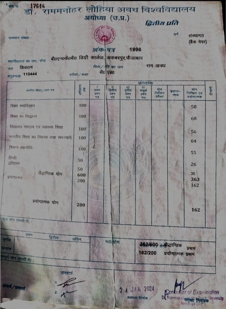 शिवराम पुत्र राम अवध उपरोक्त द्वारा 2006 में विशिष्ट बी.टी.सी. के अंतर्गत सहायक अध्यापक पद पर नियुक्ति ली गयी उक्त नियुक्ति में शिवराम के द्धारा बी.एड. के अंक पत्र में नंबर में हेराफेरी करते हुए नंबर बढ़ाकर कम्प्युटर से बना अंकपत्र लगाया है उक्त के धारा 1996 में बीएड की परीक्षा उत्तीर्ण की गयी है जिसका अभिलेखीय साक्ष्य उक्त विद्यालय के गजट में लिखित में 353/600 तथा प्रायीनिक में 132/200 लिखा हुआ है जबकि उनके द्वारा दाखिल अंक पत्र में लिखित में 363/600 तथा प्रायोगिक में 162/200 है जो कि अंतर आ रहा है जिससे साबित होता है कि उक्त शिवराम के द्वारा फर्जी अंकपत्र तैयार कराकर नौकरी प्राप्त की गयी है तथा वर्तमान में प्रधानाध्यापक के पद पर शिक्षा क्षेत्र अकबरपुर बराक अकबरपुर अम्बेडका नगर के अंतर्गत प्राथमिक विद्यालय अमौली पो० सिकंदरपुर अम्बेडकर नगर में कार्यरत है