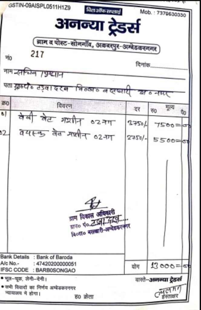 प्राप्त जानकारी के अनुसार महाबली कंस्ट्रक्शन एंड सप्लायर, अनन्या टेंडर्स सोनगांव अकबरपुर तथा गणेश ईंट उद्योग परसौली सुतहरपारा आलापुर द्वारा जारी कई बिल बिना दिनांक के पाए गए हैं, जो भारत सरकार के दिशा-निर्देशों का स्पष्ट उल्लंघन है। नियमानुसार प्रत्येक कार्य के नाम से संबंधित बिल-वाउचर ई-ग्राम स्वराज पोर्टल पर दिनांक, लोकेशन और स्पष्ट विवरण के साथ अपलोड होना अनिवार्य है।